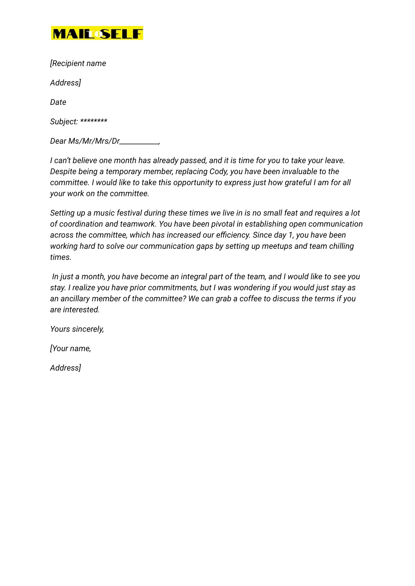In just a month, you have become an integral part of the team, and I would like to see you stay. I realize yous have prior commitments, but I was wondering if y'all would simply stay as an ancillary member of the commission? We can take hold of a java to discuss the terms if y'all are interested.